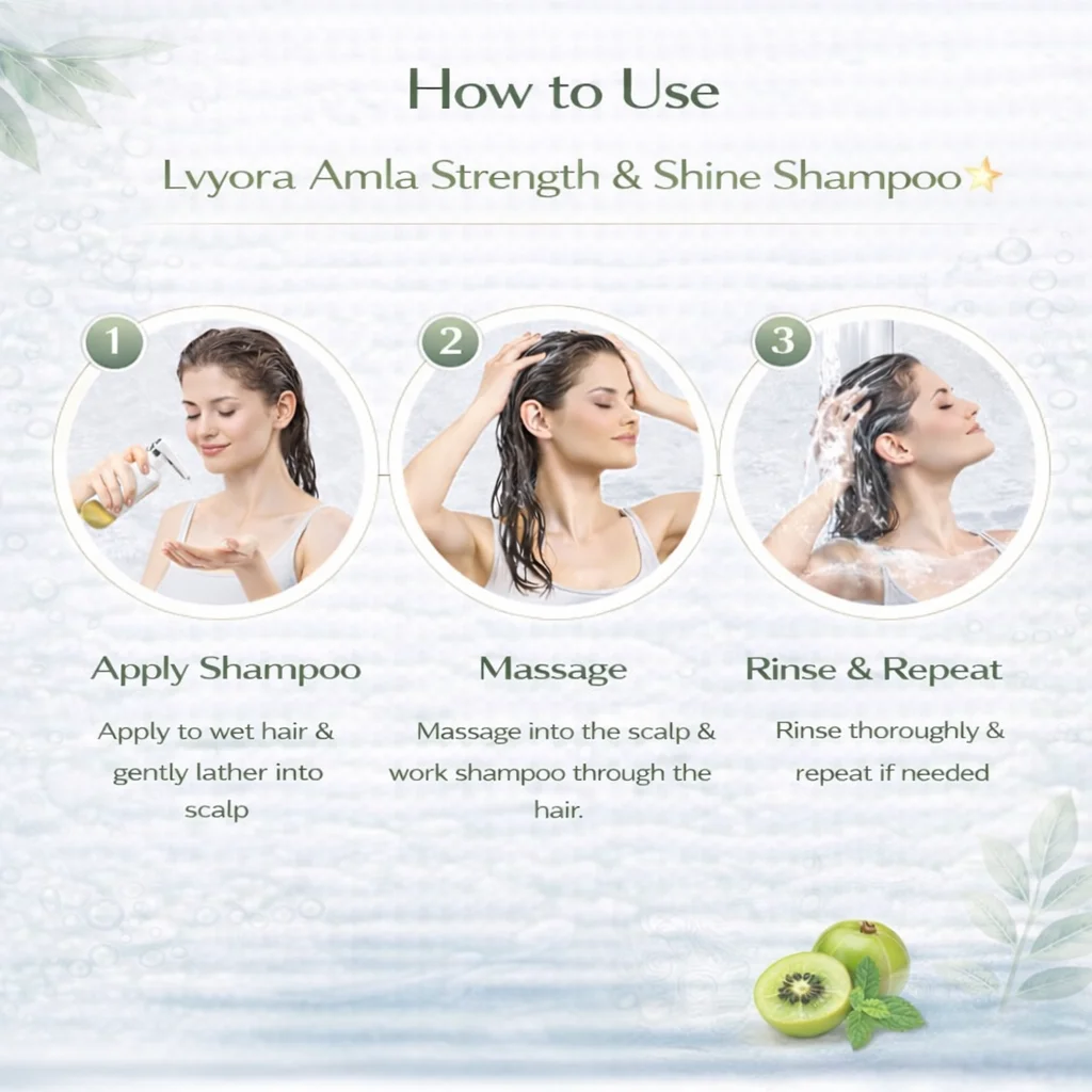 With regular use, hair looks healthy, strong, and full of life. Lvyora Amla Strength & Shine Shampoo is ideal for everyday care, delivering lasting strength, shine, and vitality for beautifully maintained hair.