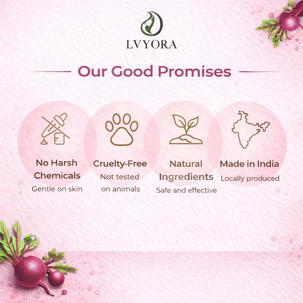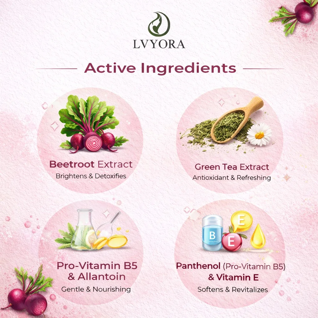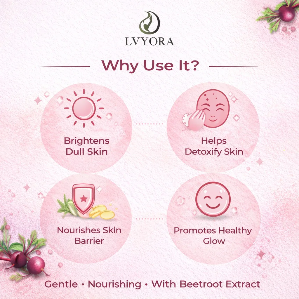 Lvyora Beetroot Glow Body Wash is a gentle cleansing formula enriched with beetroot extract to nourish the skin and enhance its natural glow.