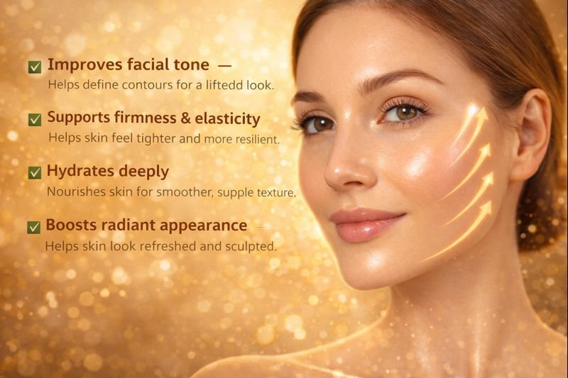 It helps improve skin firmness, enhance facial contour appearance, support elasticity, and leave skin smooth and refreshed.