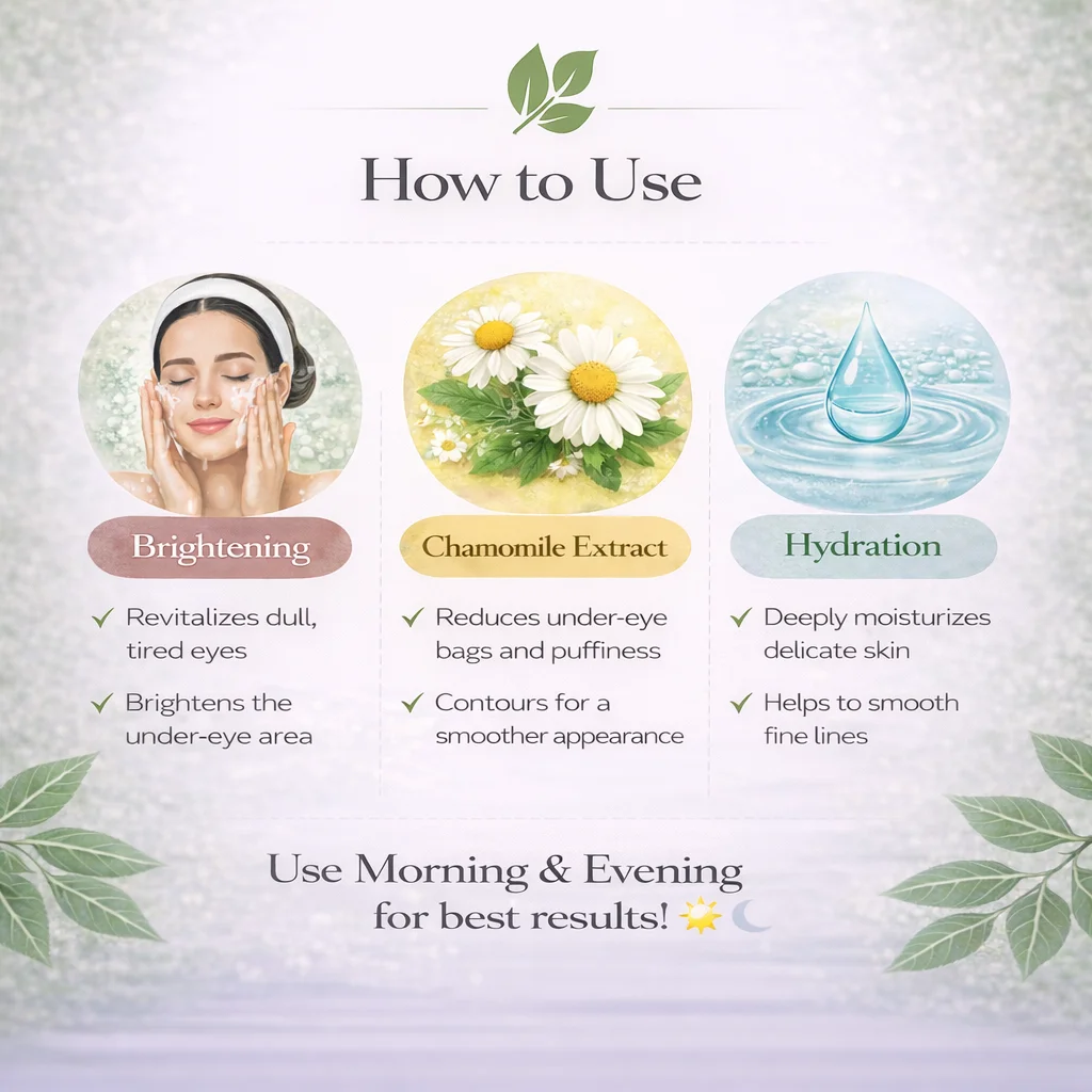 Apply a small amount around the under-eye area using your ring finger. Gently tap until fully absorbed. Avoid direct contact with eyes.