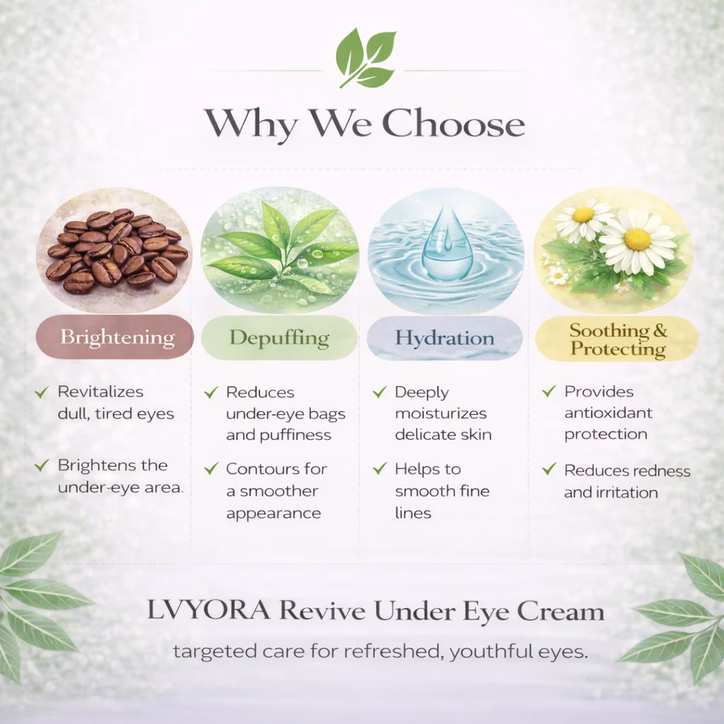 With regular use, eyes appear brighter, smoother, and more well-rested. Lvyora Revive Under Eye Cream brings targeted care to your daily routine, helping the eye area look fresh, revived, and naturally radiant.
