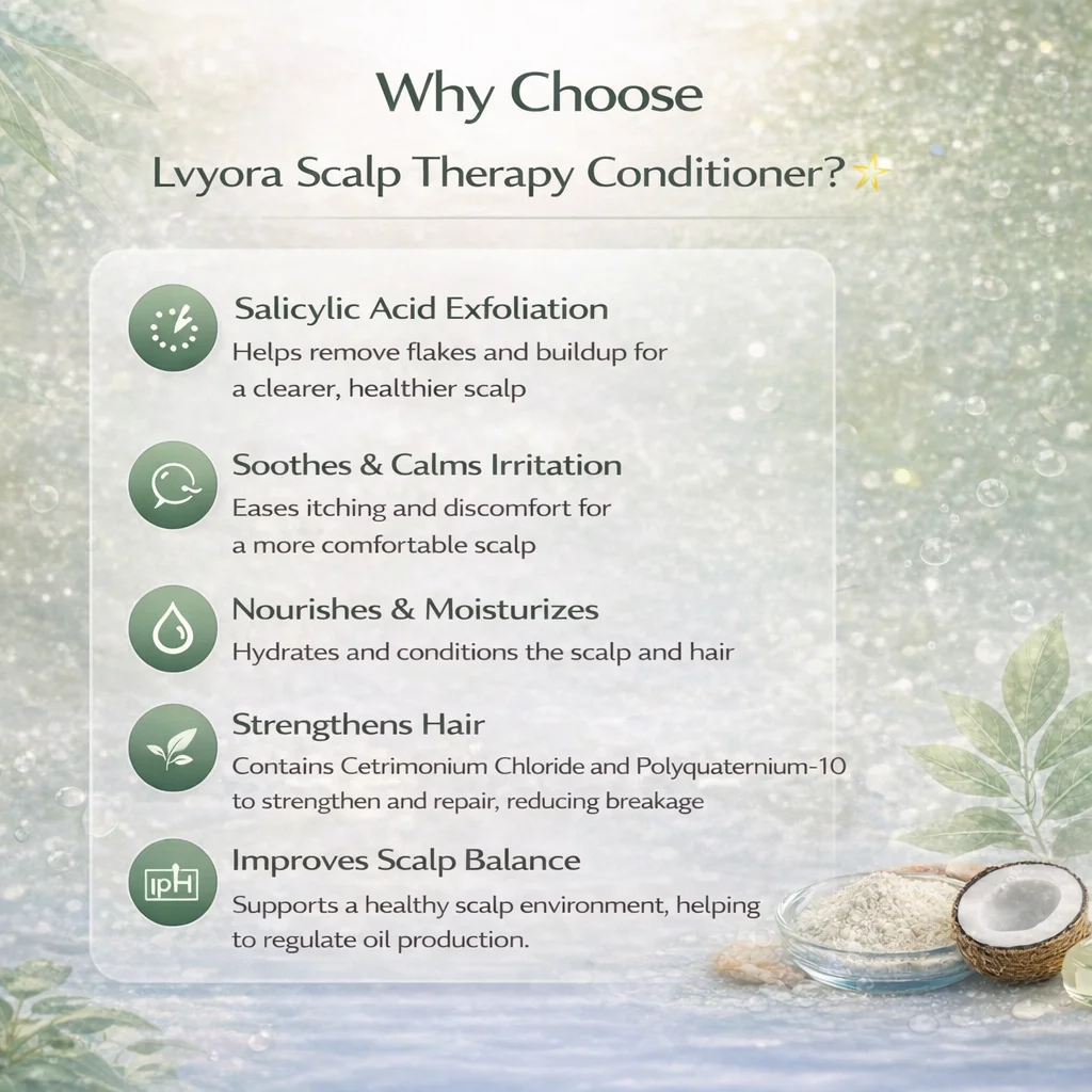 Lvyora Scalp Therapy Conditioner is thoughtfully formulated to soothe and nourish the scalp while providing deep conditioning care to the hair. It helps restore essential moisture, easing scalp dryness and irritation while supporting overall scalp comfort and balance.