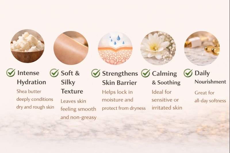 It delivers deep hydration, improves skin softness, strengthens the moisture barrier, and leaves the skin smooth and silky.