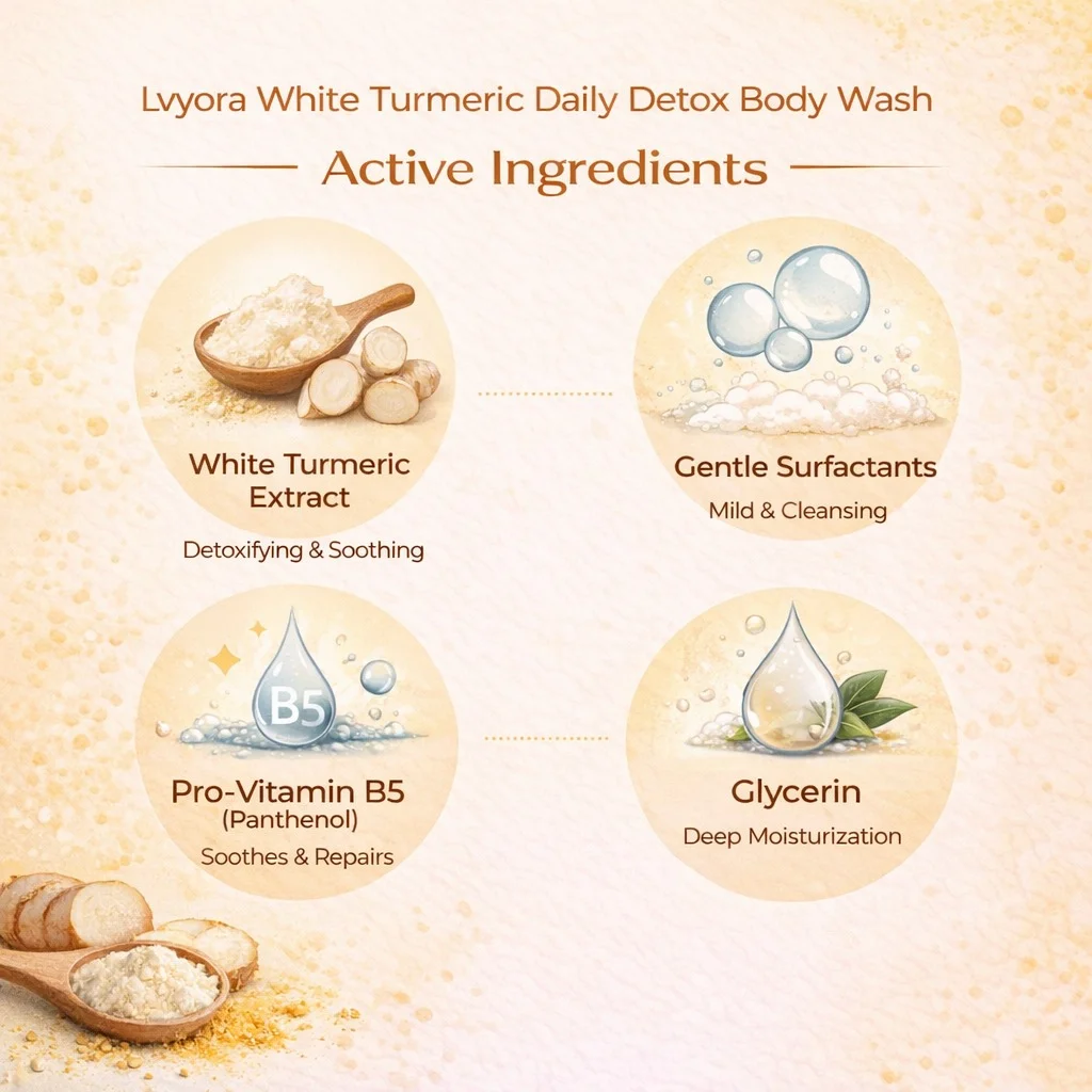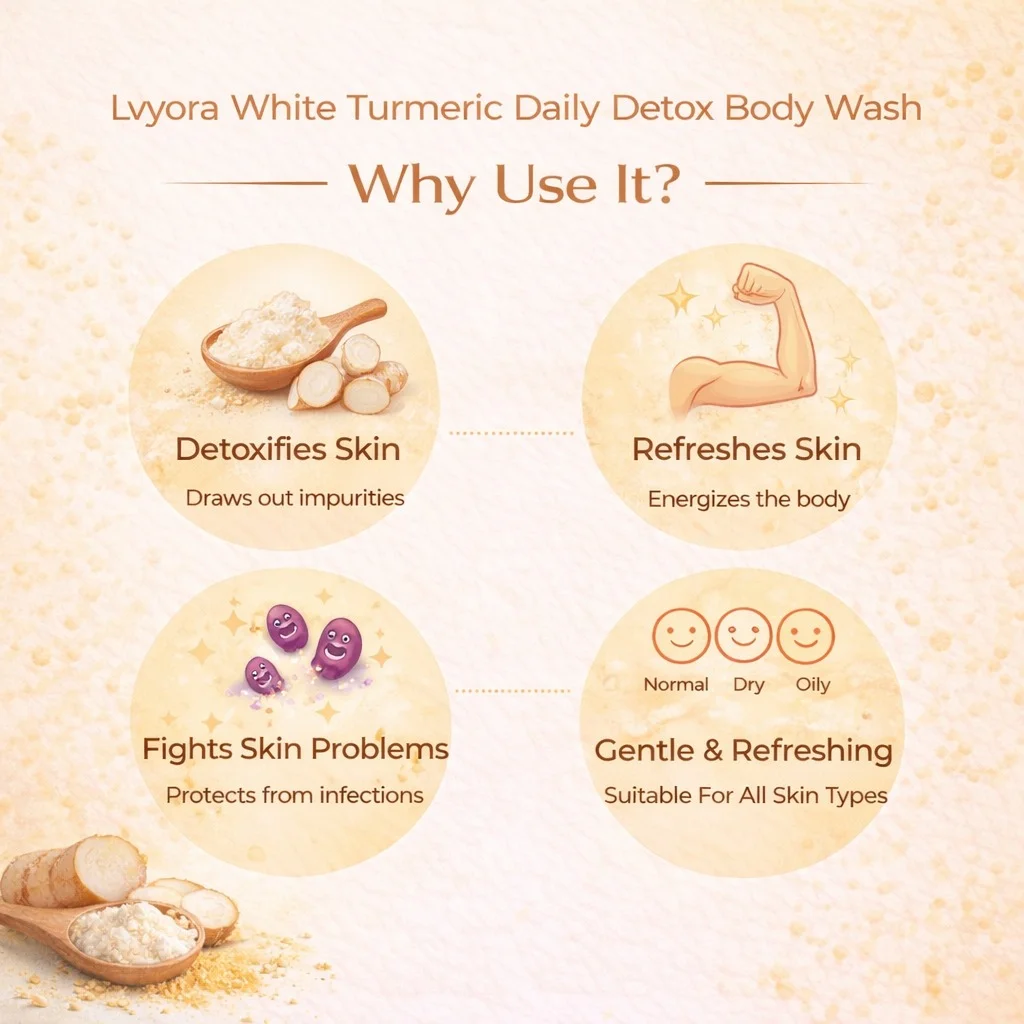 Lvyora White Turmeric Daily Detox Wash is a gentle yet effective cleanser designed for everyday skin care. Enriched with the goodness of white turmeric, it helps cleanse and detoxify the skin while supporting clarity and natural balance. The mild formula removes daily impurities without disturbing the skin’s moisture barrier.